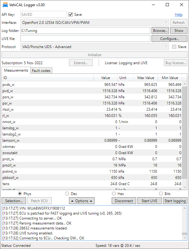 Log measurement parameters at high refresh rates on supported ECUs. Whether standard diagnostic ID’s or the full RAM in advanced mode. Definitions are provided to you by the server, and the tool works with existing J2534 interfaces.